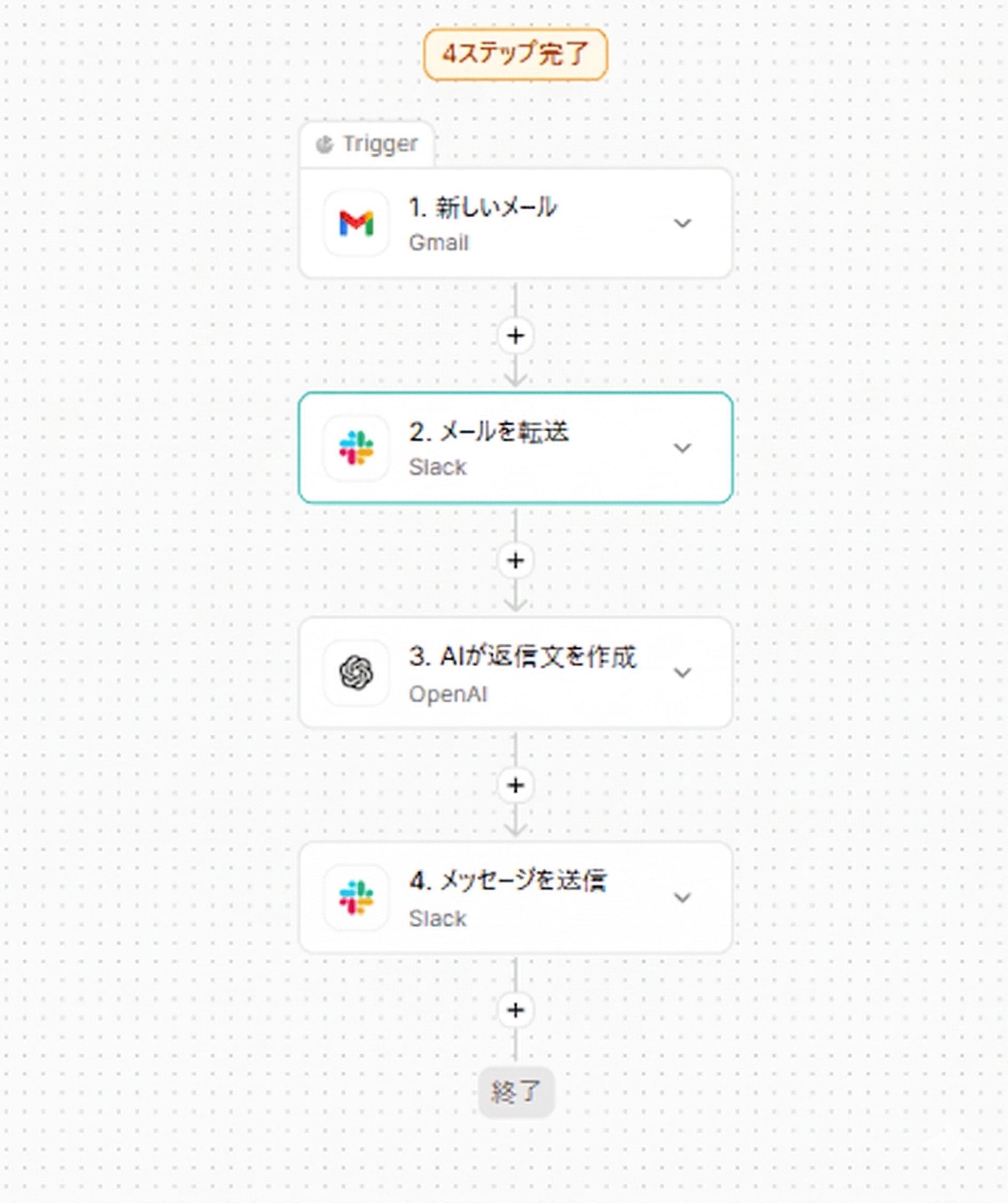 例えば、顧客からの問い合わせ対応を自動化する仕組みも簡単に構築可能です。問い合わせを受信すると、AIが内容を分類して担当者を判定し、自動で回答の案を作成してチャットで通知します。