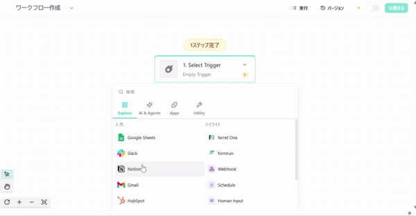 workrunは、プログラミング知識がなくても、視覚的で直感的なUI(操作画面)を通じてAIワークフローを簡単に構築できます。