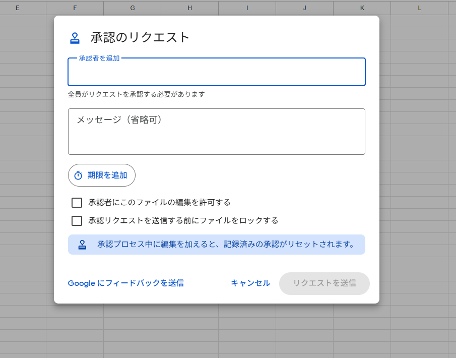 承認してほしい人の名前やメールアドレスを入力し、必要であればメッセージや期限を追加しましょう。