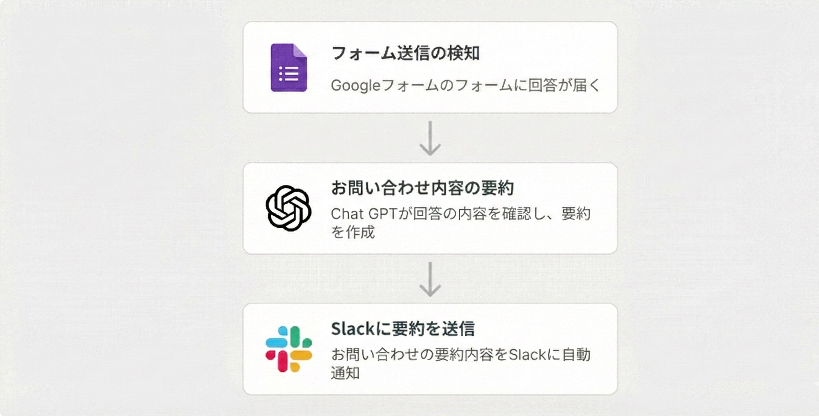 Googleフォームの回答をきっかけ(トリガー)に、スプレッドシートへの記録から担当者への通知、返信メールの下書き作成・送信までを一連のフローで自動化できます。