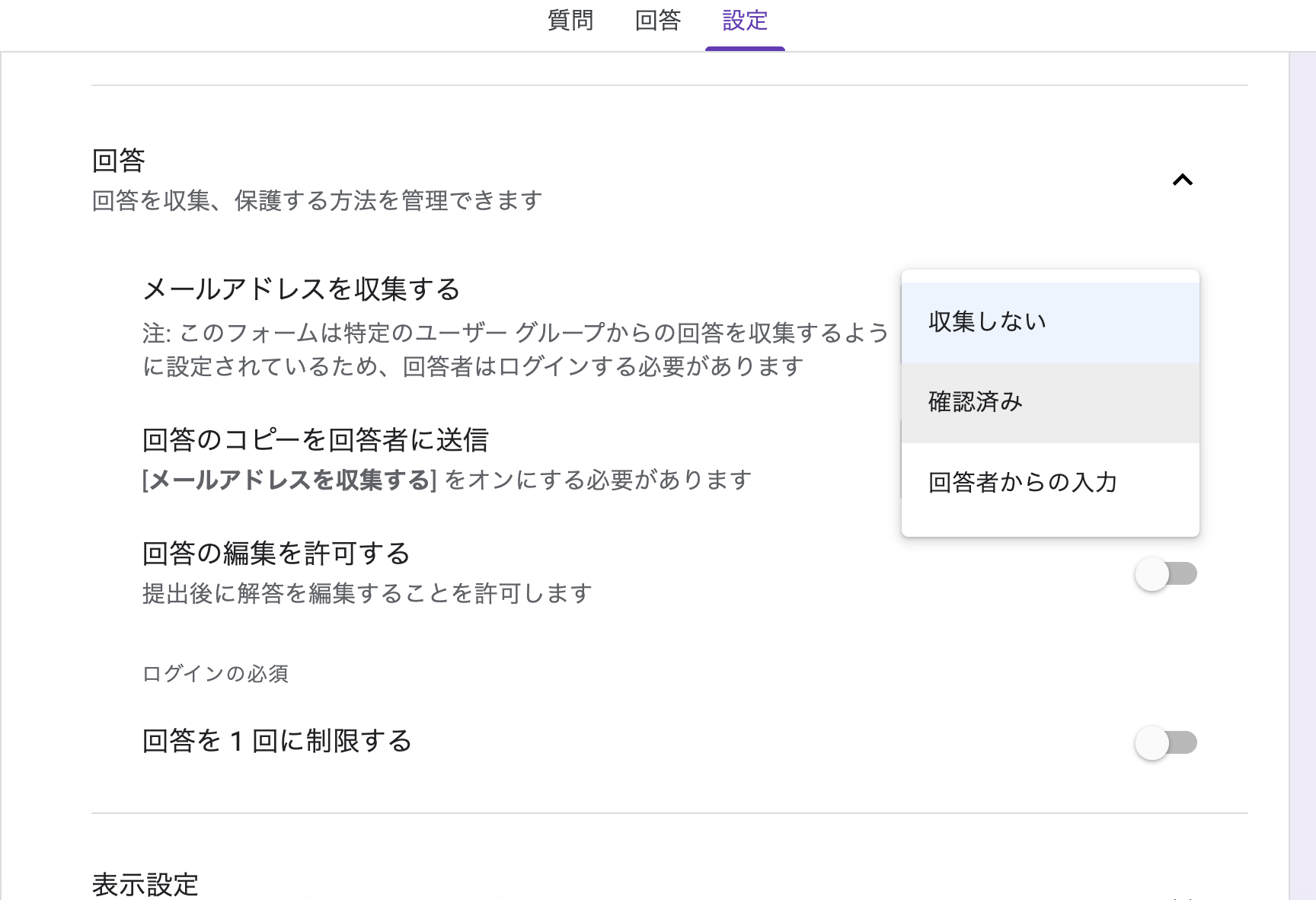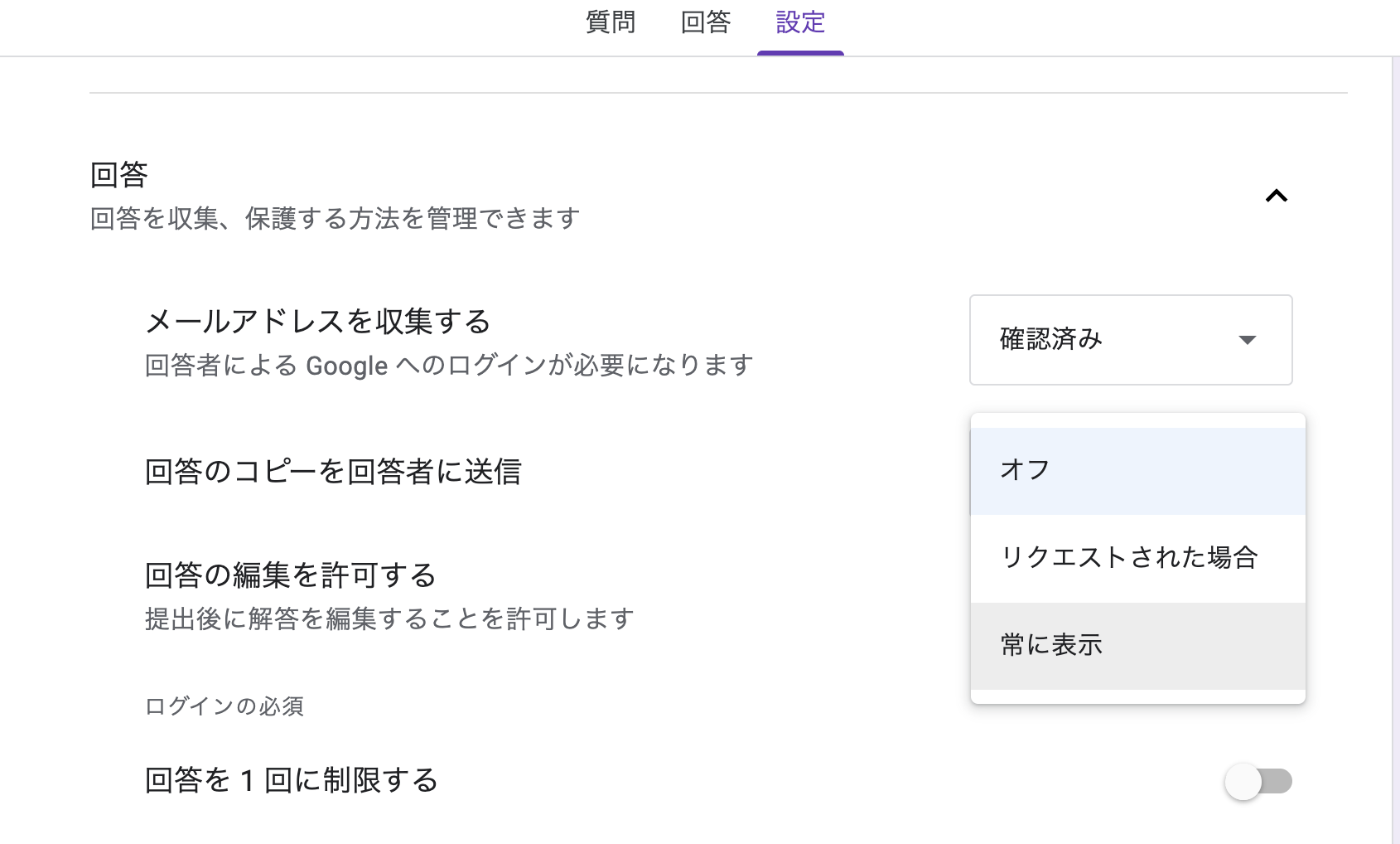 - 「回答」にある「メールアドレスを収集する」を「確認済み」または「回答者からの入力」に変更
