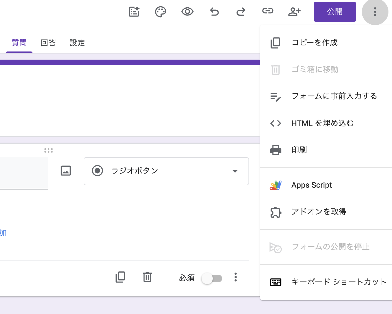 Google フォームと紐づくスクリプトエディタにアクセスし、メール送信処理を実行するためのコードを追加します。フォーム編集画面右上の「その他(3点リーダー)」から「スクリプトエディタ」を選択してください。新しいタブでコードの入力画面が開きます。