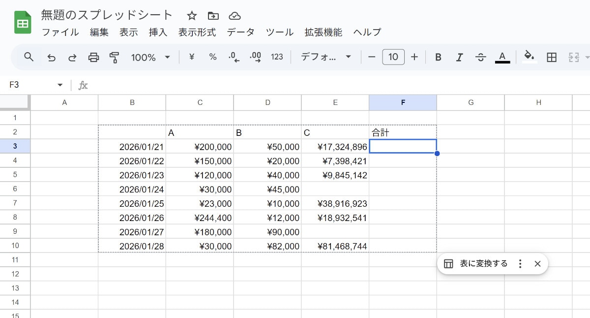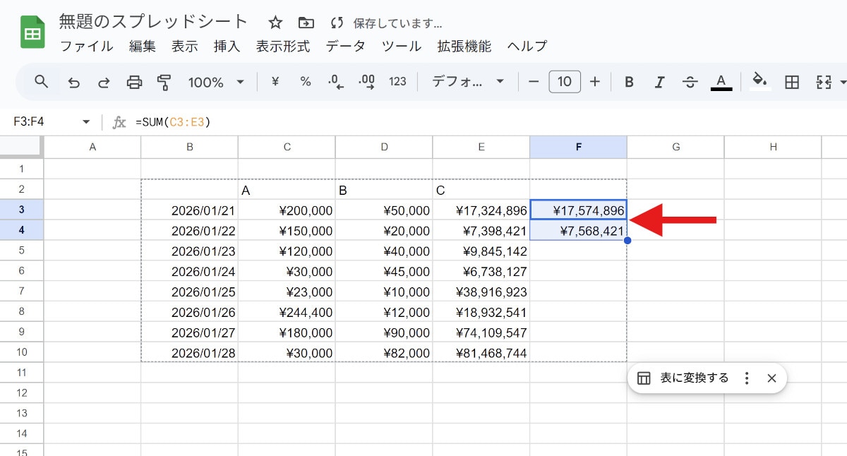 下にドラッグしたことで、下の行の合計値も計算されたことがわかります。