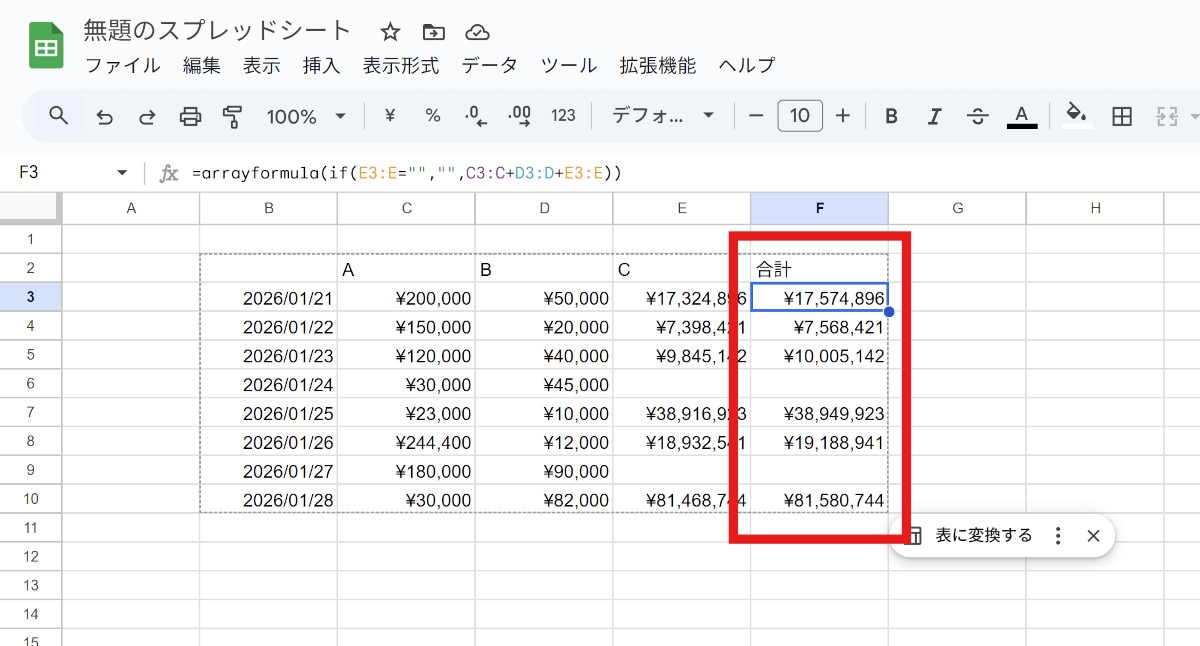その場合の関数は以下のようになります。ARRAYFORMULA関数では、SUM関数よりもシンプルな四則演算での加算のほうがシンプルに記述できることもあります。