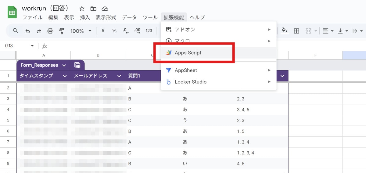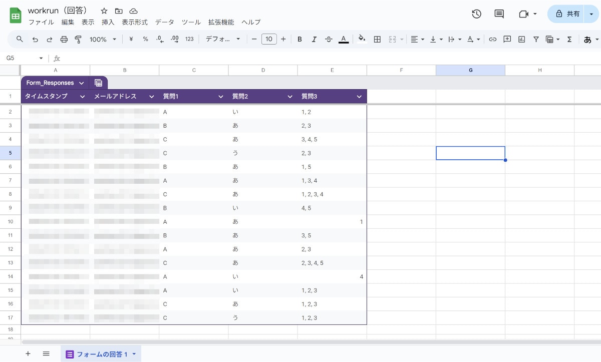 まずはGoogleフォーム側でスプレッドシート連携をしておき、回答をスプレッドシートに記録していきます。今回用意したフォームでは、以下のようにA列~E列まで記入されます。