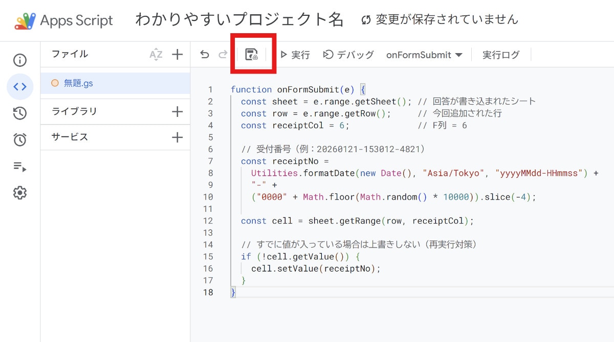 function onFormSubmit(e) { const sheet = e.range.getSheet(); // 回答が書き込まれたシート const row = e.range.getRow(); // 今回追加された行 const receiptCol = 6; // F列 = 6 // 受付番号(例:20260121-153012-4821) const receiptNo = Utilities.formatDate(new Date(), "Asia/Tokyo", "yyyyMMdd-HHmmss") + "-" + ("0000" + Math.floor(Math.random() * 10000)).slice(-4); const cell = sheet.getRange(row, receiptCol); // すでに値が入っている場合は上書きしない(再実行対策) if (!cell.getValue()) { cell.setValue(receiptNo); } } |