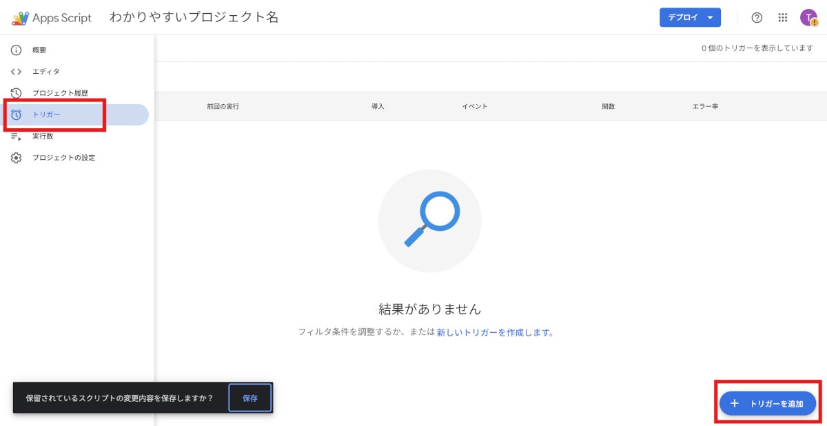サイドメニューから「トリガー」ページに進み、「トリガーを追加」を選択します。