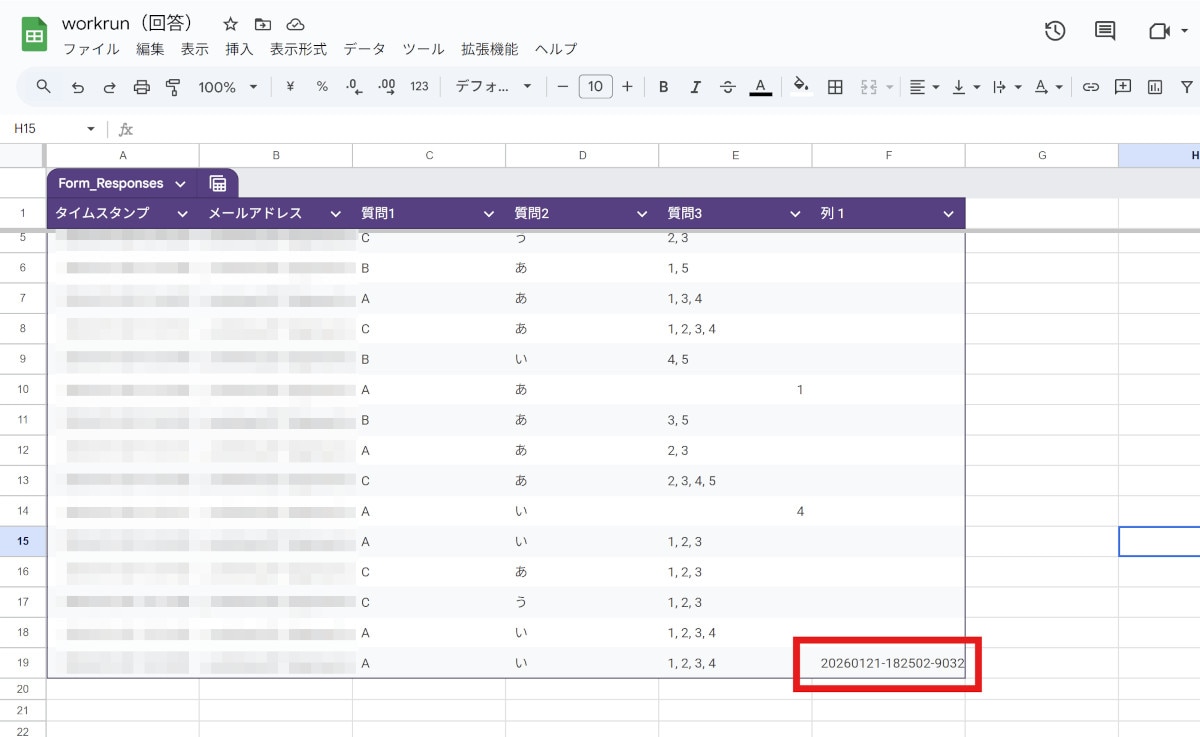その後、フォームに回答があると、F列に受付番号が自動で追加されたのがわかります。