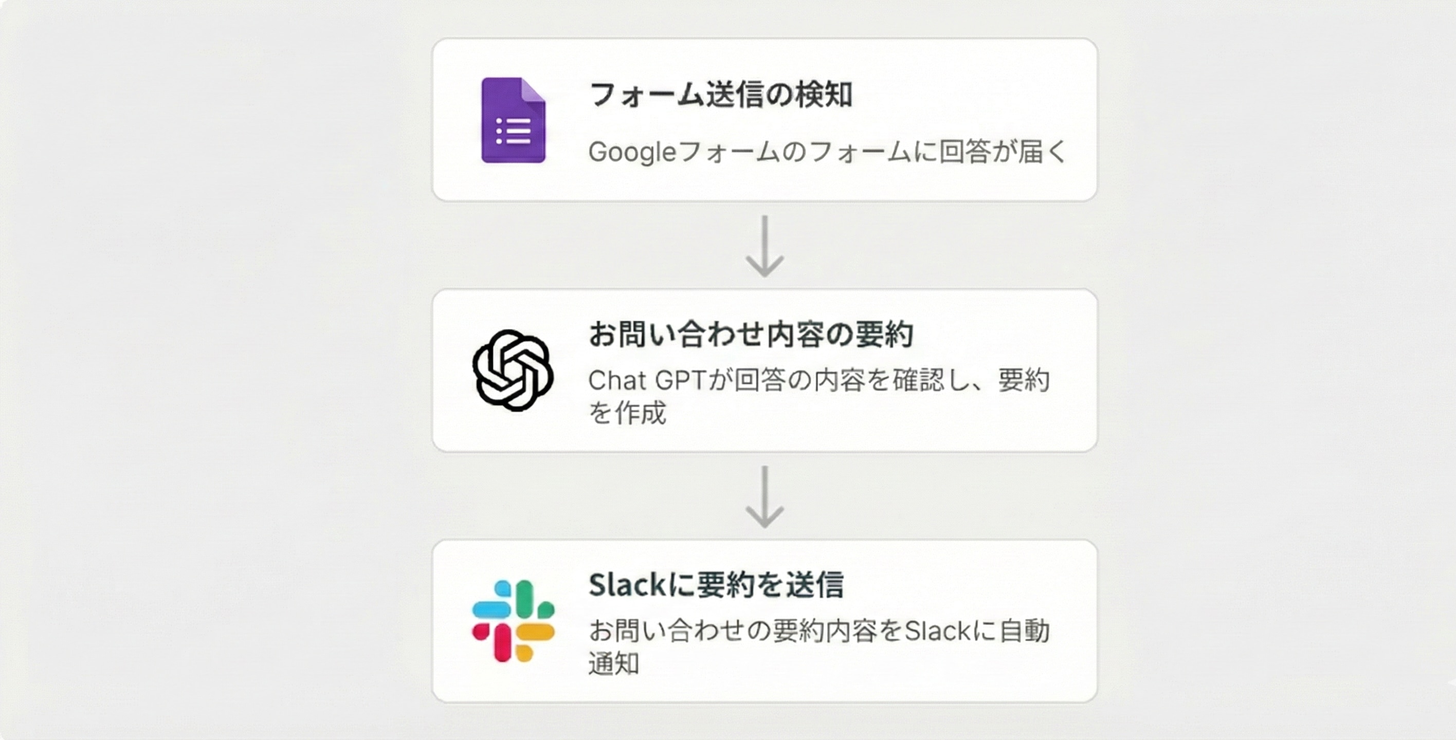 たとえば、アンケート回答の自由記述をChatGPTが読み取り、傾向を分類(要望・不満・改善案など)したうえで、重要ポイントを要約してSlackやTeamsに自動通知するといった使い方が可能です。