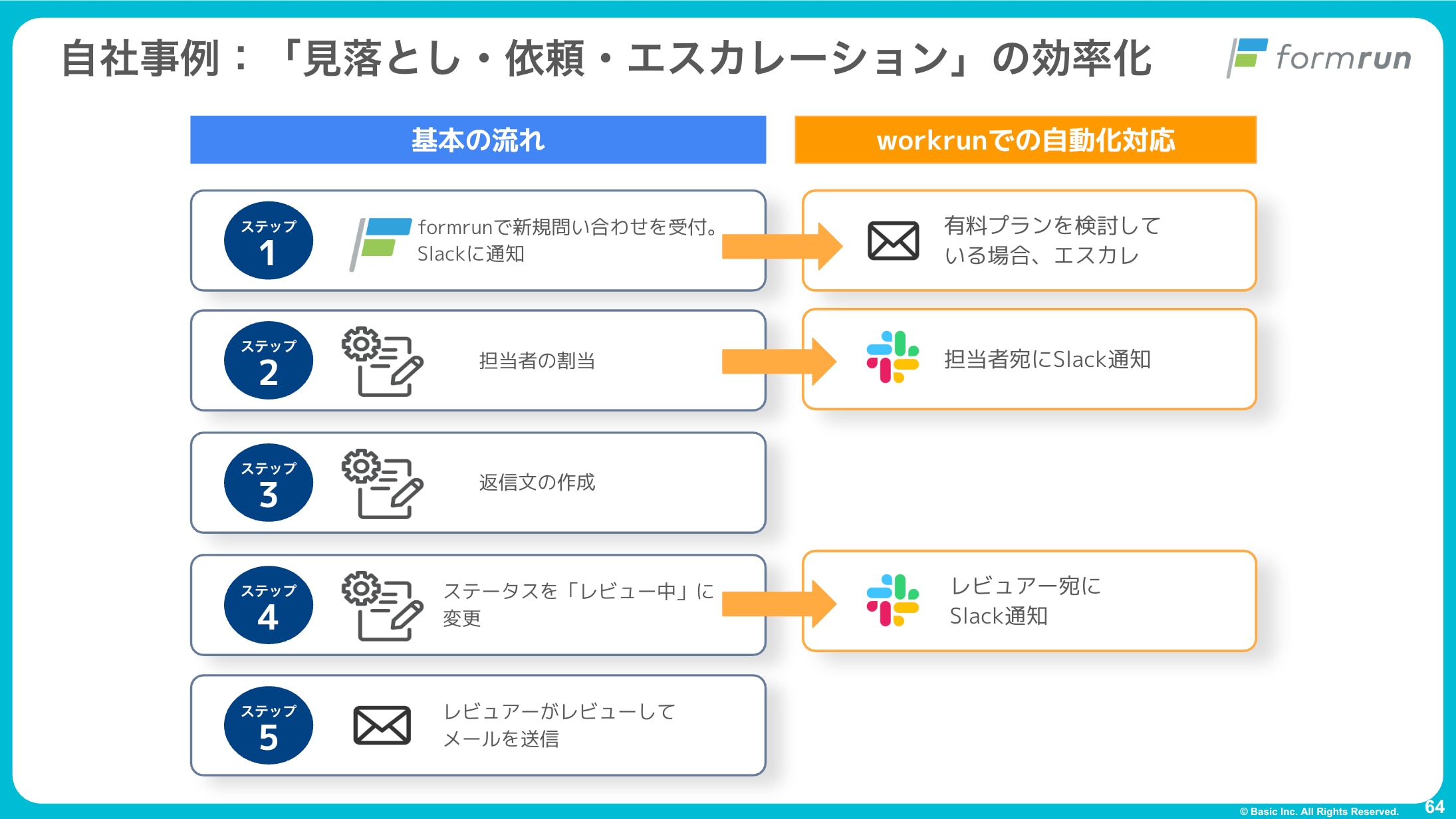 現在 workrun は、formrun のお問い合わせ対応に付随する、次の3つの作業を自動化するために利用しています。