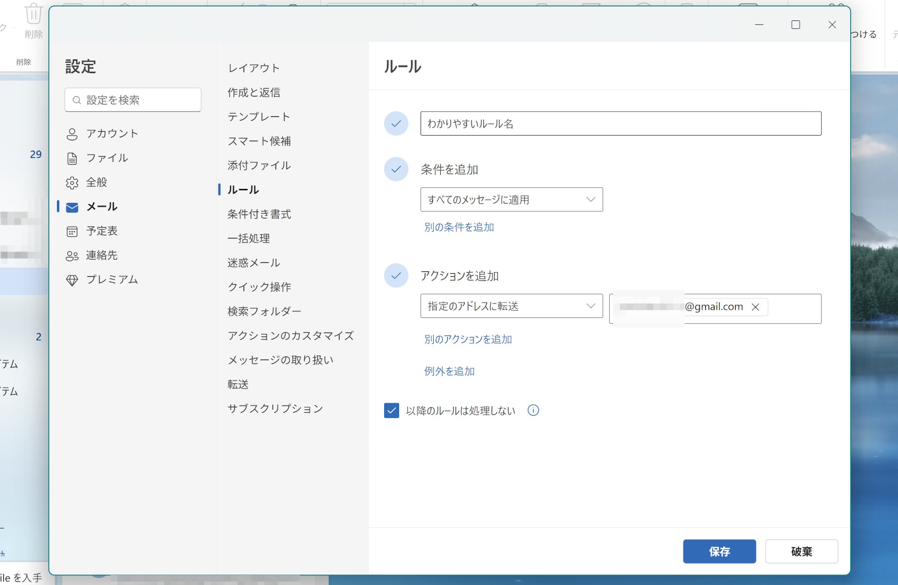 Outlookでは、ルールを使って条件に一致するメールだけを転送できます。すべてをGmailへ流すのではなく、差出人、件名、フォルダなどで絞って重要メールだけ転送したい場合に向いています。