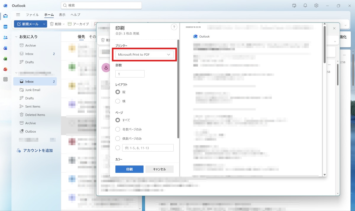 もっとも標準的で、すぐ試せるのが「印刷」からPDFに出力する方法です。Windowsの「Microsoft Print to PDF」をプリンターとして選ぶことで、メールをそのままPDFファイルにできます。
