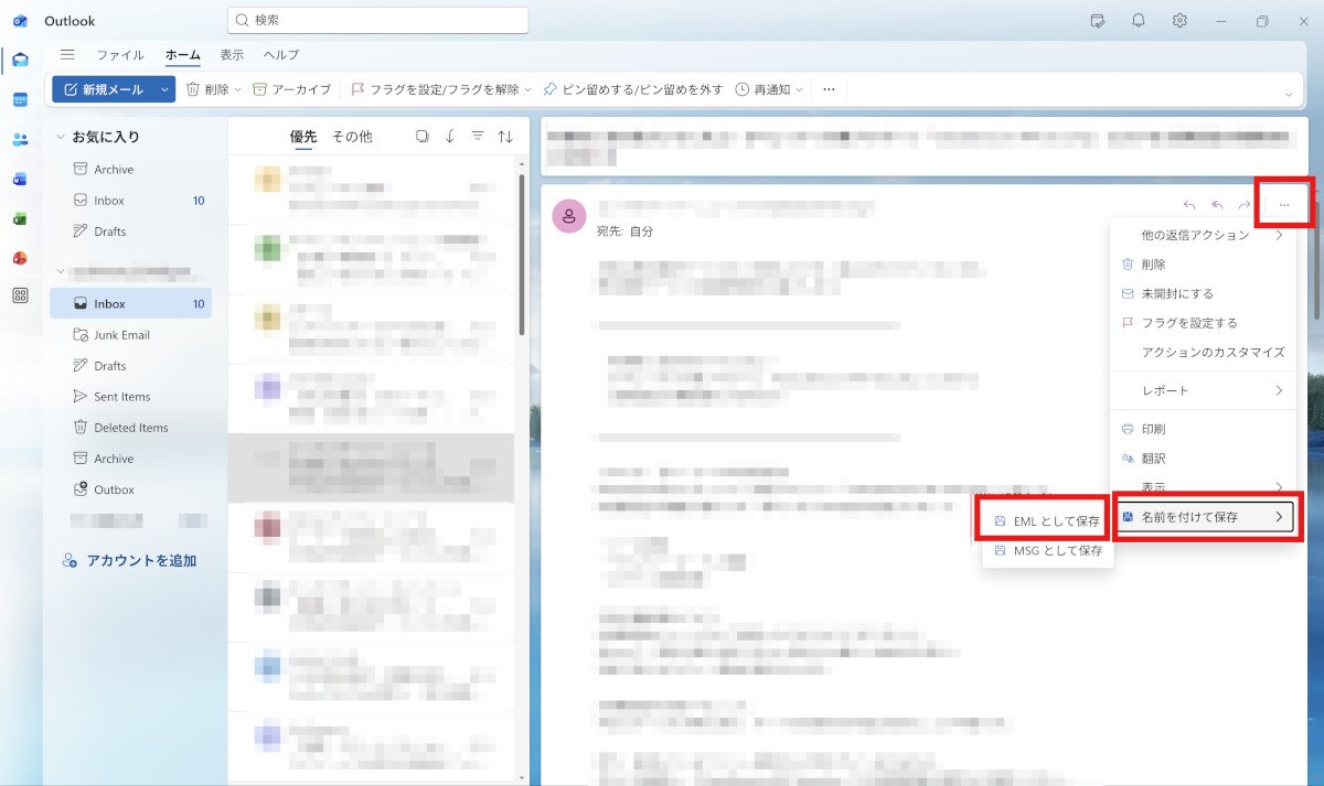 新しいOutlookでは「名前を付けて保存」でフォルダ(ローカルまたはクラウド)に保存する導線が案内されています。