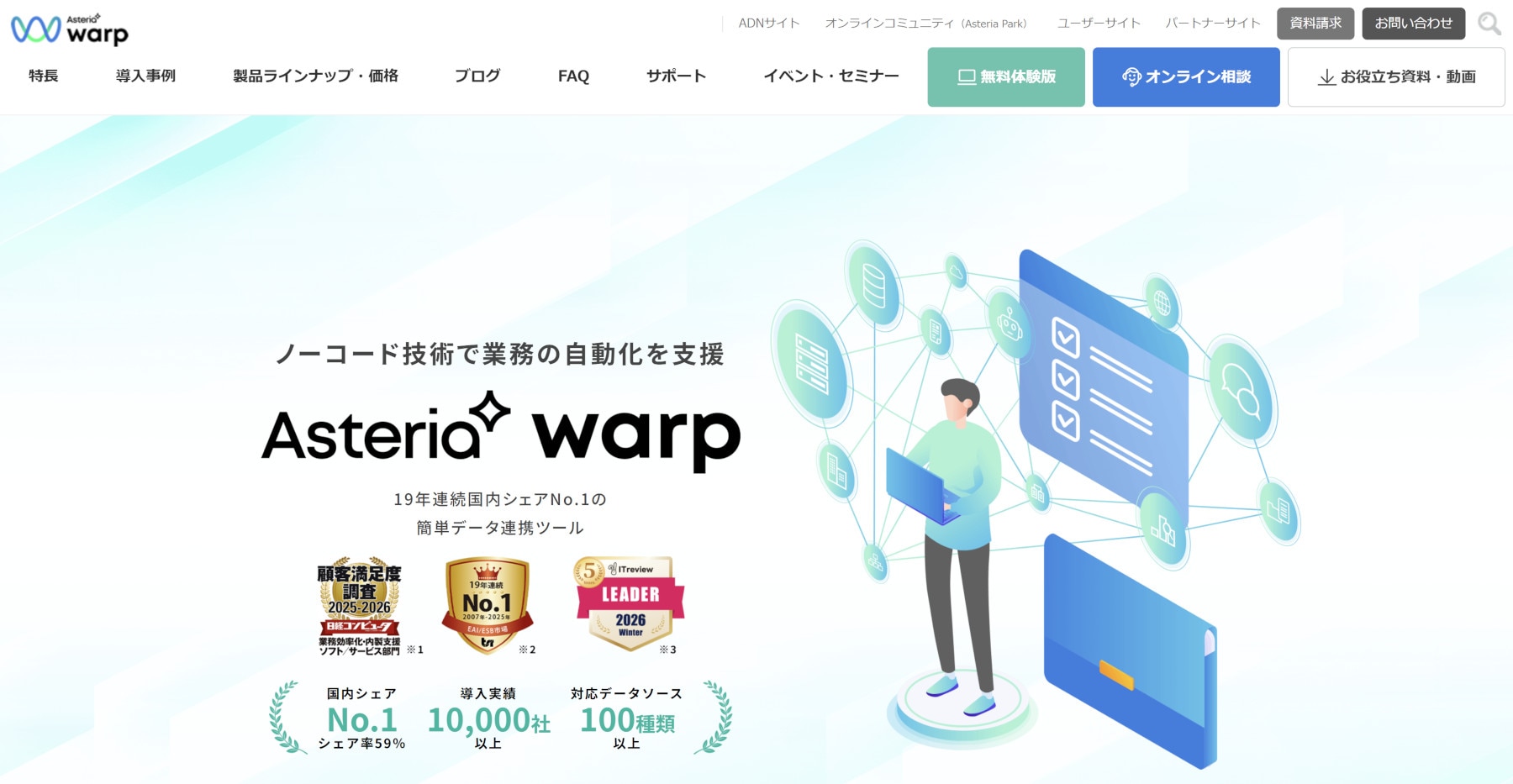 ASTERIA Warpは、ノーコードでデータ連携を設計し、業務自動化やデータ活用につなげるためのデータ連携ツールです。国内シェアや導入実績、対応データソース数も公式に示されており、幅広い企業で使われていることが分かります。公式サイトでは、導入実績10,000社以上、対応データソース100種類以上と案内されています。