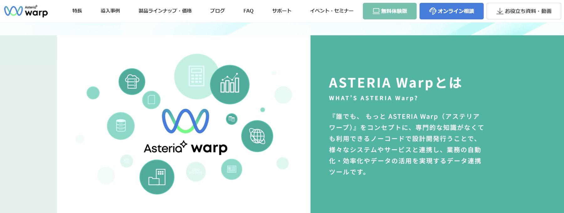 ASTERIA Warpは、ノーコードでデータ連携を設計し、業務自動化やデータ活用につなげるためのツールです。公式にも、ノーコードでさまざまなシステムやサービスと連携し、業務の自動化・効率化やデータ活用を実現する製品として案内されています。
