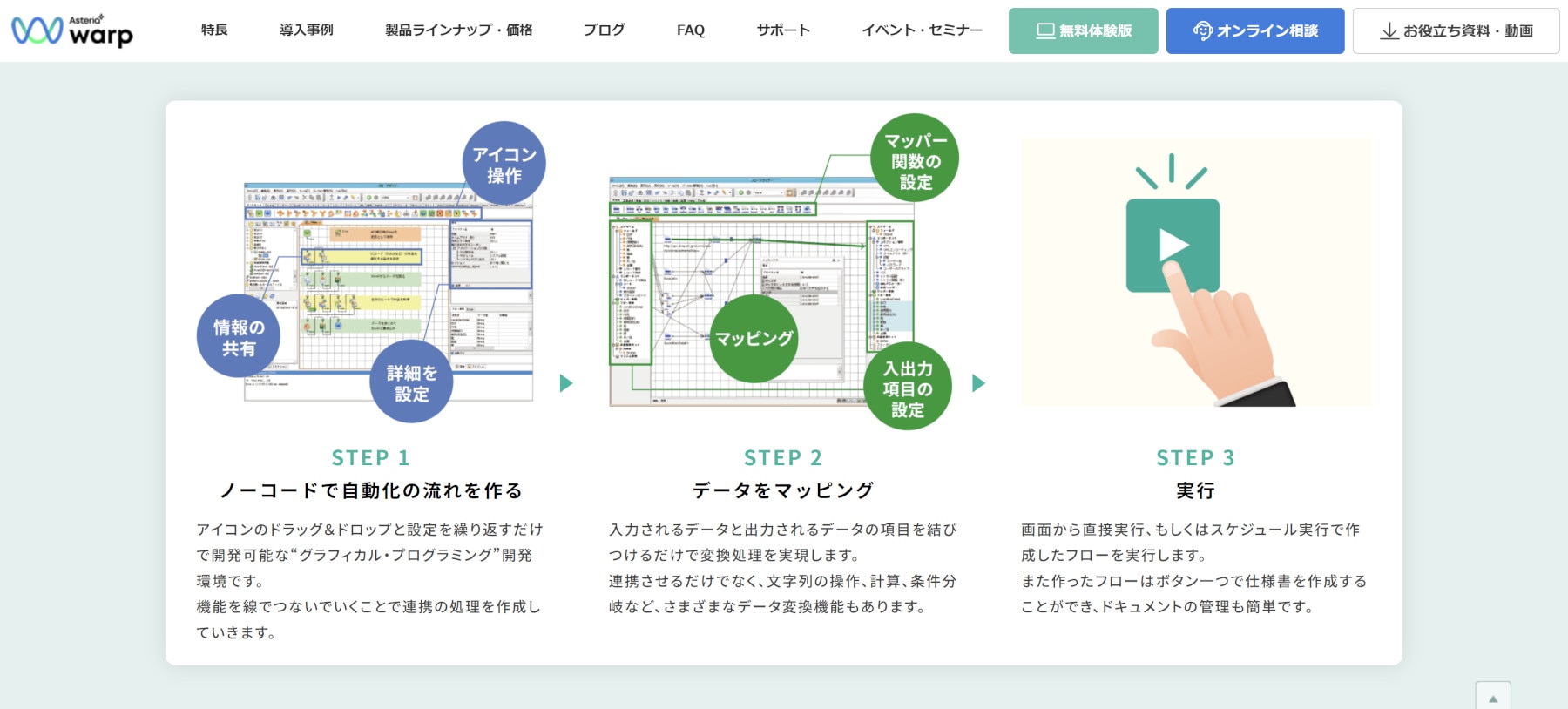 ASTERIA Warpの大きな特長は、プログラミングを書いて連携を作るのではなく、フローとして処理を組み立てることです。クラウド版の公式説明でも、アイコンのドラッグ&ドロップと設定を繰り返し、機能を線でつないで処理を作成すると案内されています。