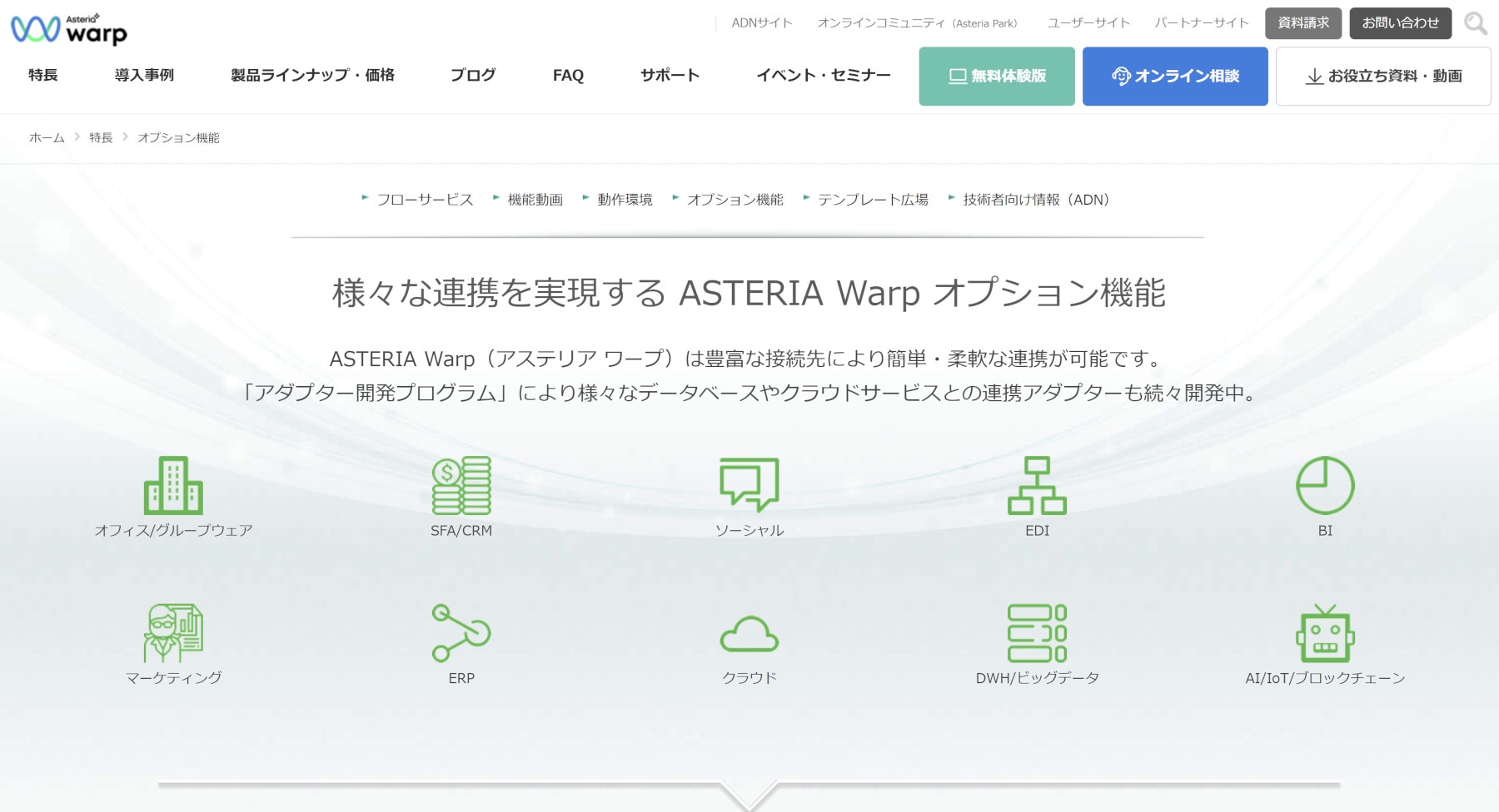 公式のオプション機能ページでは、ASTERIA Warpは豊富な接続先により簡単・柔軟な連携が可能であり、さまざまなデータベースやクラウドサービスとの連携アダプターが用意されていると説明しています。カテゴリも、オフィス/グループウェア、SFA/CRM、ERP、クラウド、DWH/ビッグデータなど幅広く取り揃えられています。