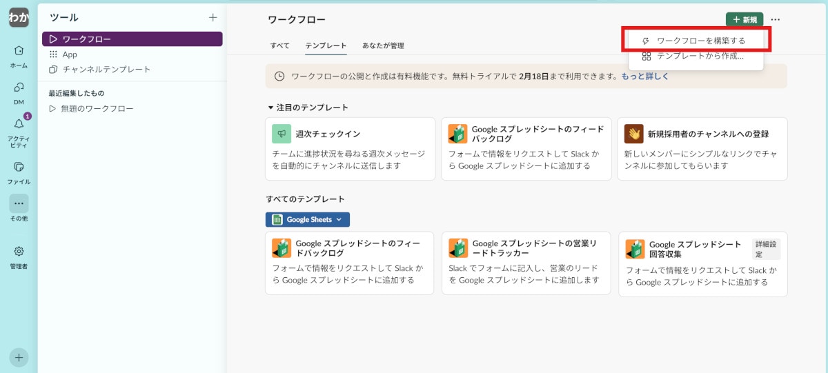 まずはサイドバーから「ワークフロー」にアクセスし、右上の「新規」から「ワークフローを構築する」を選択します。