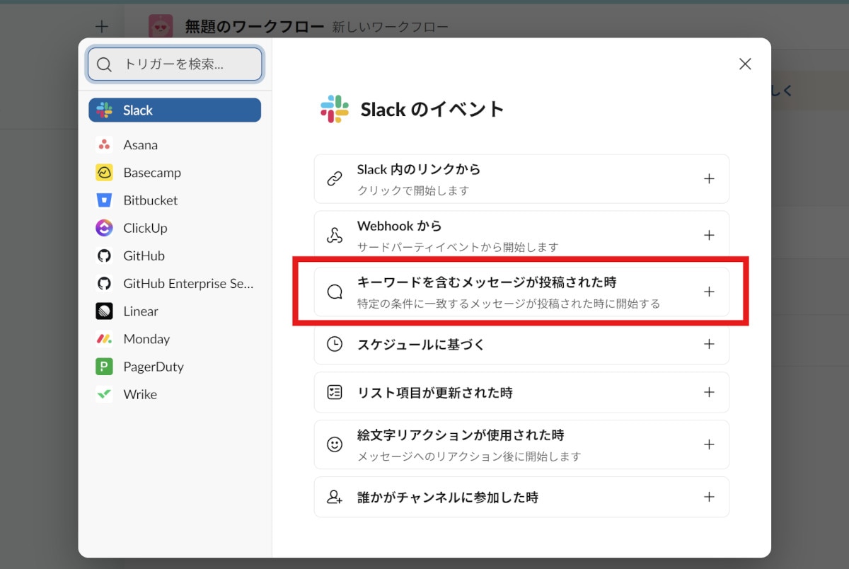 今回は、Slackの「キーワードを含むメッセージが投稿された時」をイベントに設定します。