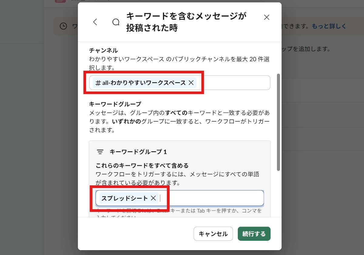 対象となるチャンネルを選択し、トリガーにしたいキーワードを入力します。