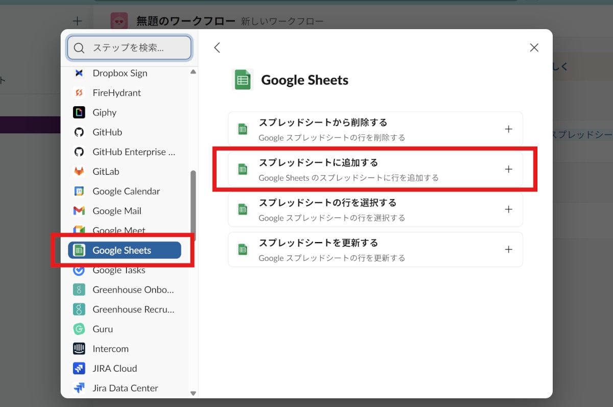 Slack公式のワークフロービルダーでは、Googleスプレッドシートのステップを追加して、ワークフローからデータ送信や取り込みを行えます。特に「フォーム入力→スプレッドシートに行追加」の導線は、申請や報告を台帳化する用途と相性がよく、まず試しやすい方法です。