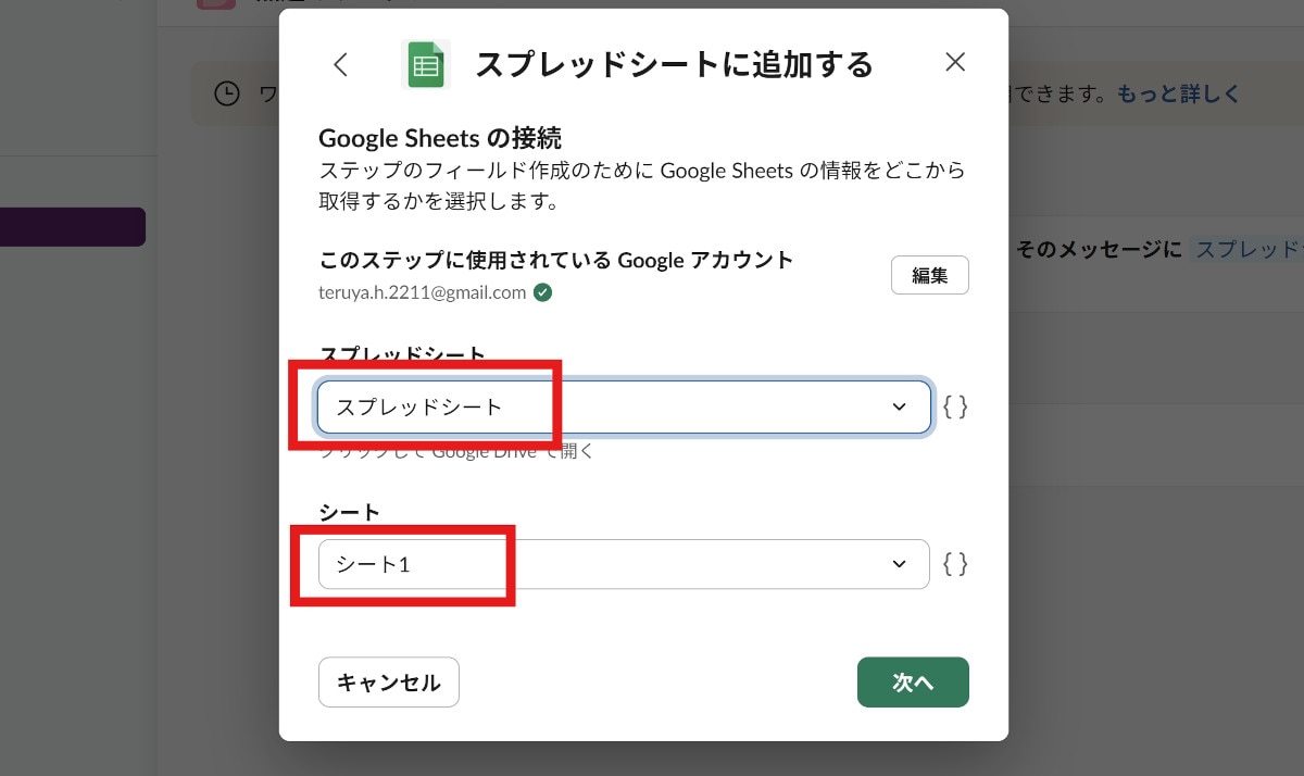 アカウント連携が完了したら、Slackと連携するスプレッドシートとそのシートを選択します。