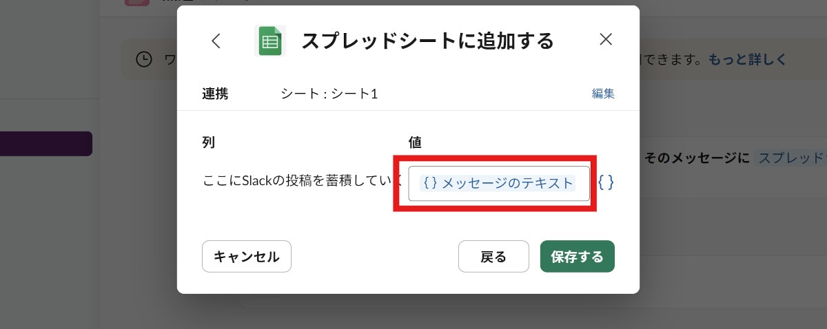 スプレッドシートに追加する値を、右の{}マークから選択します。メッセージのテキストの他、メッセージ送信者などが選択できます。