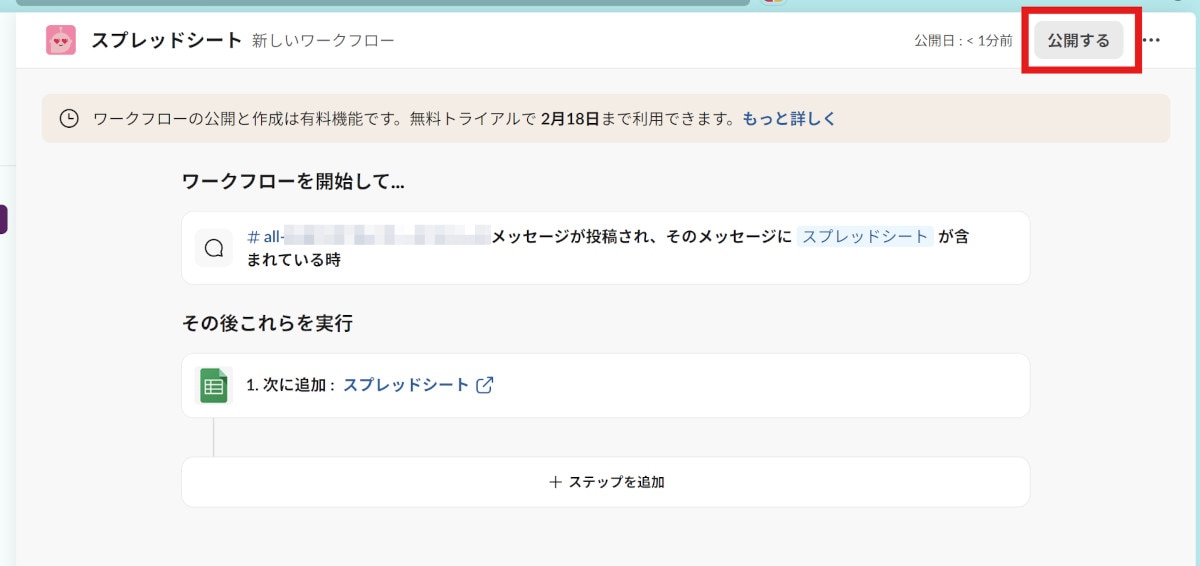 方法① Slack公式(ワークフロービルダー)でスプレッドシートに書き込む