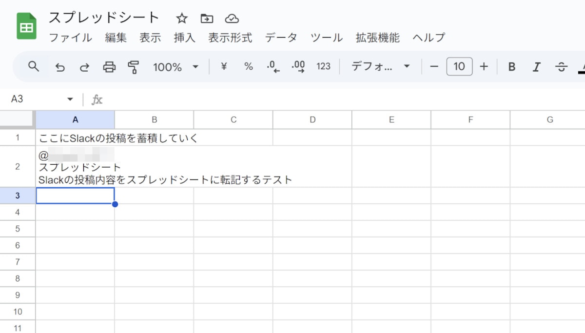 指定したSlackのチャンネルにトリガーとなる「スプレッドシート」を含めてメッセージを投稿したところ、無事、指定したシートに投稿者とメッセージ内容が記録されました。